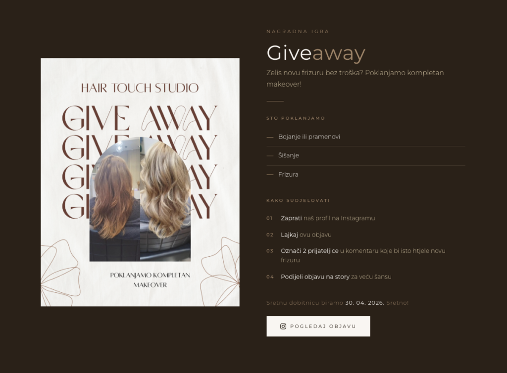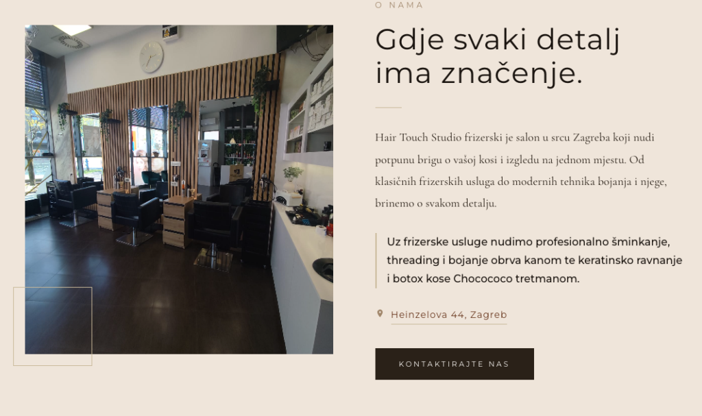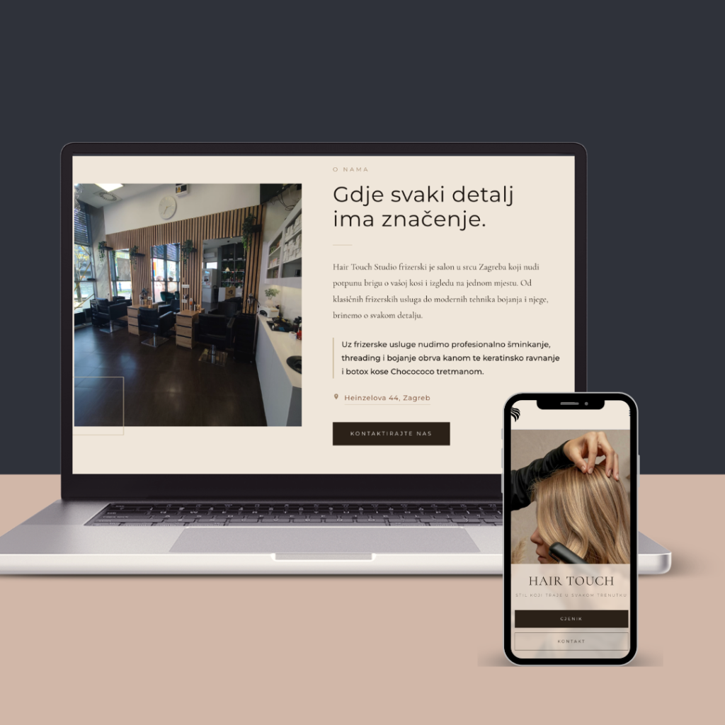 Za frizerski studio Hair Touch izrađena je moderna i pregledna web stranica u WordPressu, prilagođena identitetu salona i potrebama klijentela. Cijeli vizual stranice prati tople bež i smeđe tonove, čime je stvoren elegantan i profinjen izgled koji odgovara estetici brenda i uslugama koje salon nudi.