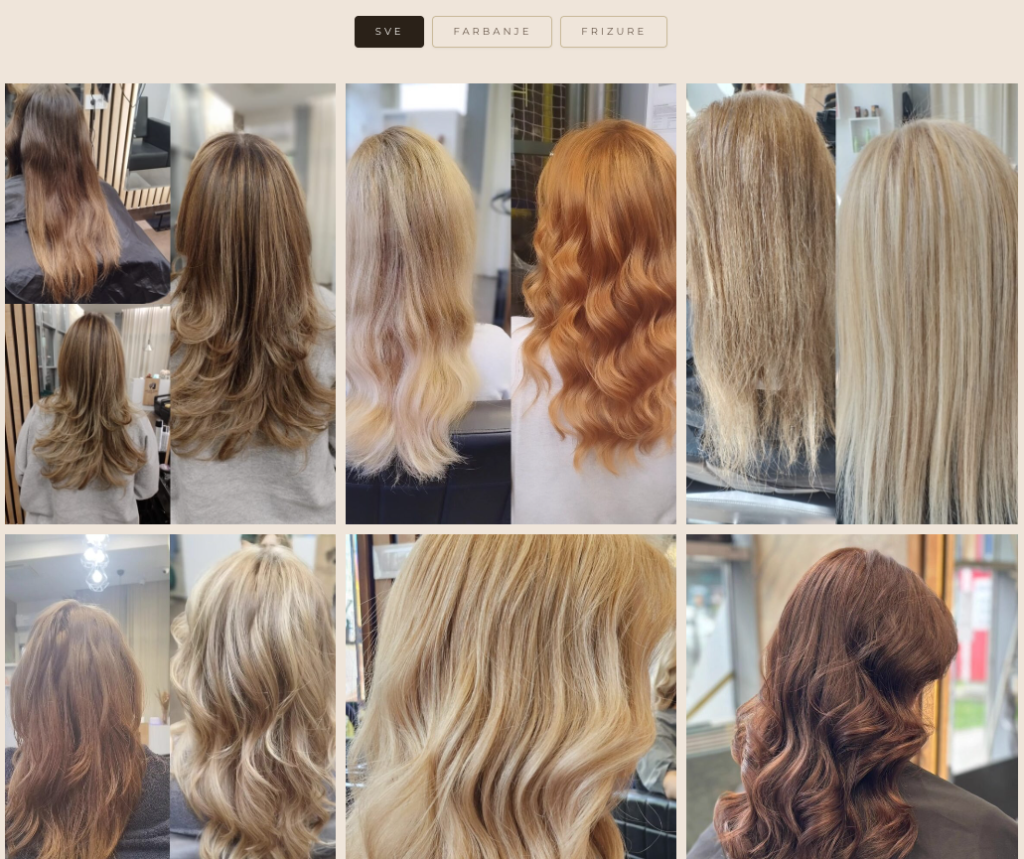 Izrađena je prilagođena galerija radova s mogućnošću filtriranja po kategorijama kao što su šišanje, farbanje, muško šišanje, pletenice i svečane frizure. Svaka fotografija otvara se u lightboxu s navigacijom, što posjetiteljima pruža pregledan i ugodan vizualni prikaz radova salona.